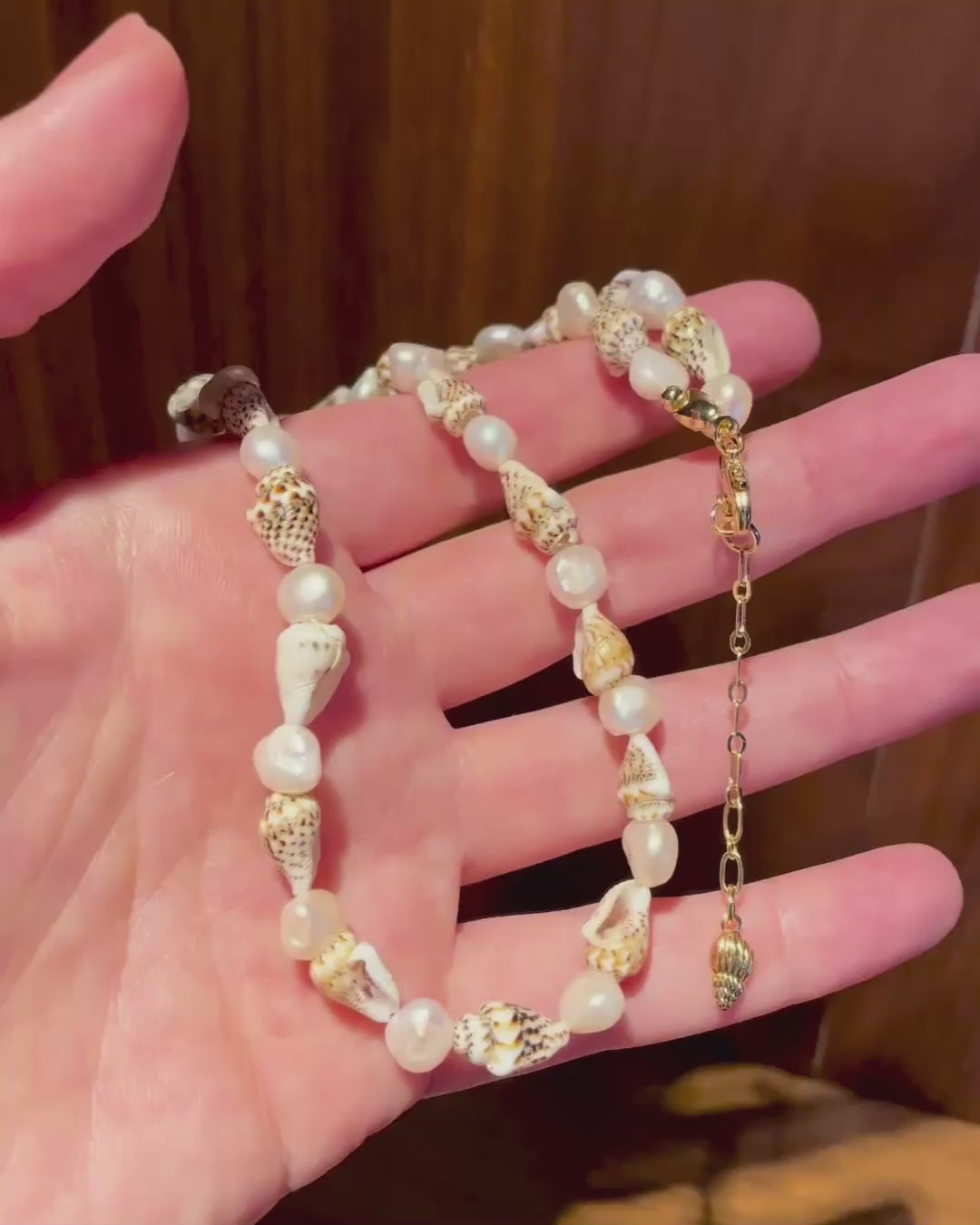 Colar em banho ouro 18k com conchinhas naturais e pérolas barrocas.