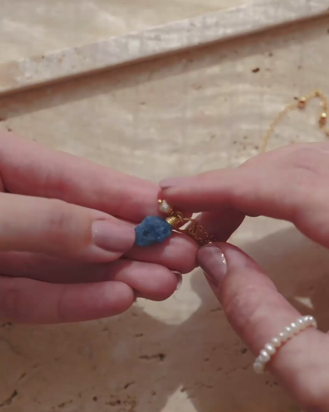 Esse colar carrega a energia vital para a criatividade! Dizem que a energia da apatita te impulsiona na direção certa para se sentir bem, motivado e produtivo.