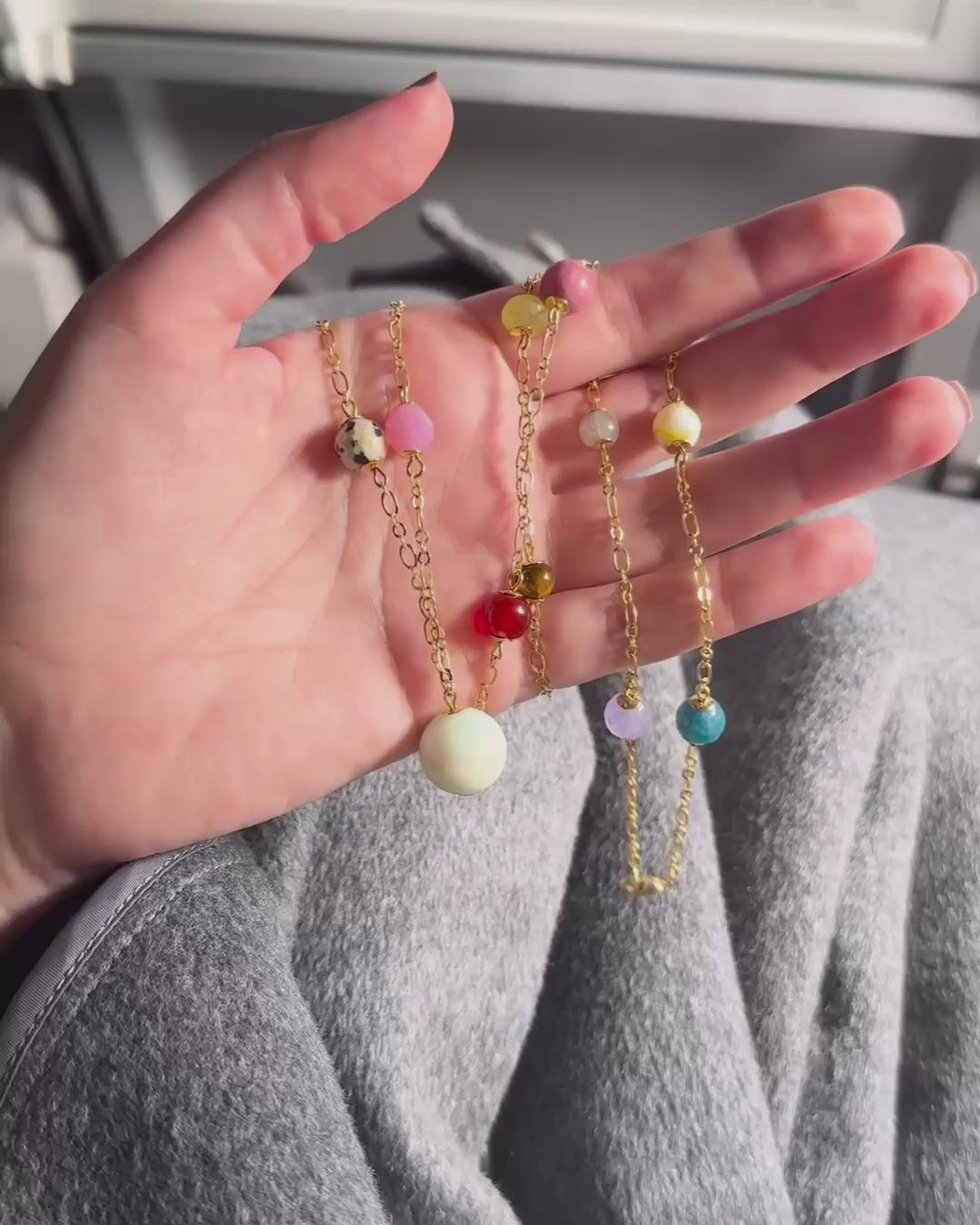 Colar longo com pedras naturais de amazonita, ágata, jade, jaspe, labradorita, olho de tigre e lápis lazuli - energia de sabedoria, equilíbrio, força, coragem, feminilidade e amor.