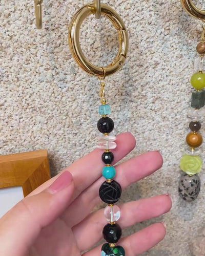 Pingente de bolsa em banho ouro 18k com jade, quartzo natural, ágata negra e murano.