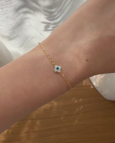 Como diz o nome, ela é chiquitita, mas apenas em aparência! Em banho ouro 18k com madrepérola e olho grego, essa pulseira é para enfeitar, proteger e trazer amor incondicional por todas suas fases.