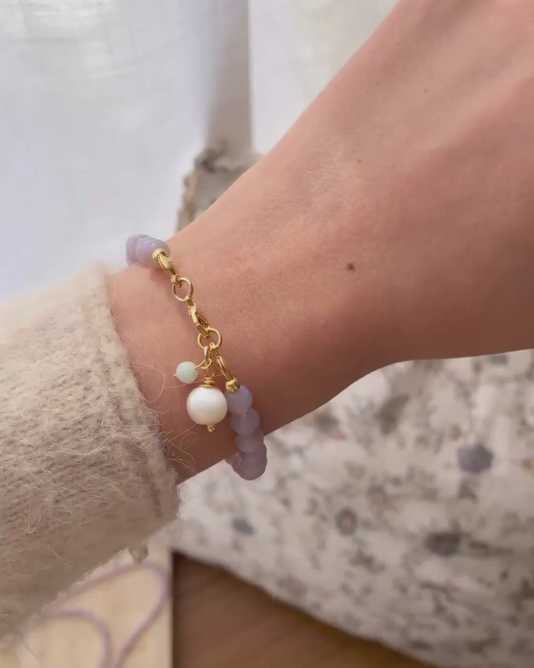 Pulseira em banho ouro 18k com murano lavanda e pingente de pérola barroca e gotinha de amazonita.