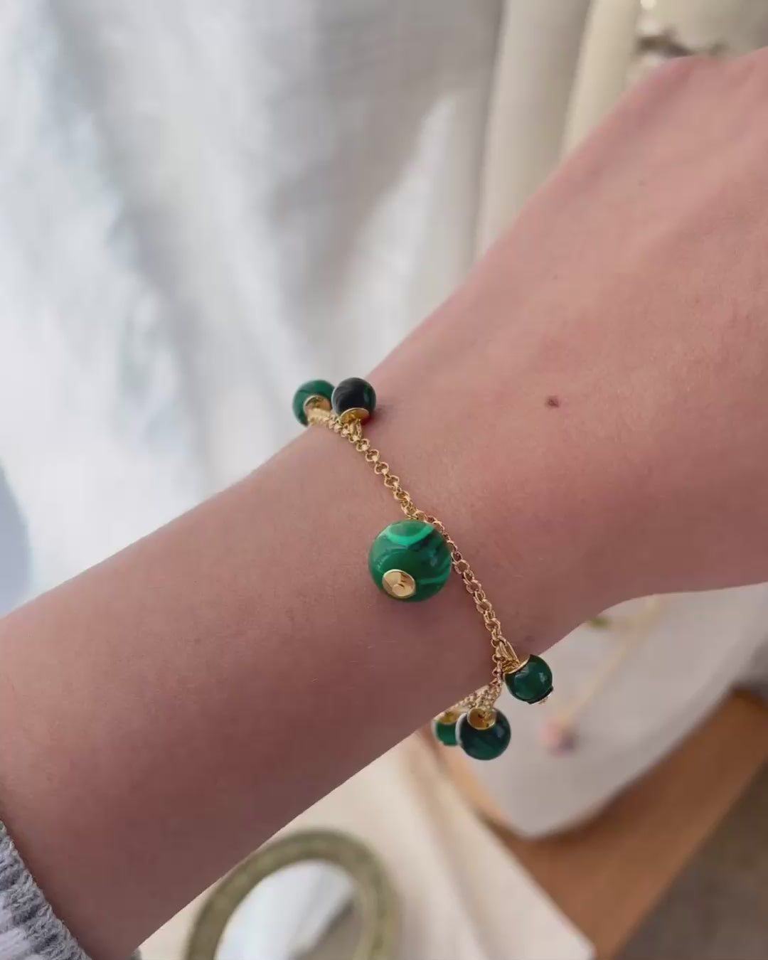 Pulseira em banho ouro 18k com pedrinha malaquita para sorte, proteção e felicidade.